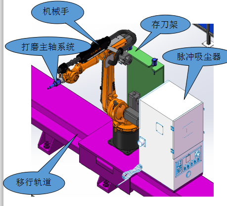 钻杆焊缝打磨系统主要由变位机装置,机器人打磨装置,换刀组织,安全防护,控制系统等几部分组成。配有视觉检测系统,打磨过程在线跟踪检测。实现在线监控打磨,提高打磨质量。